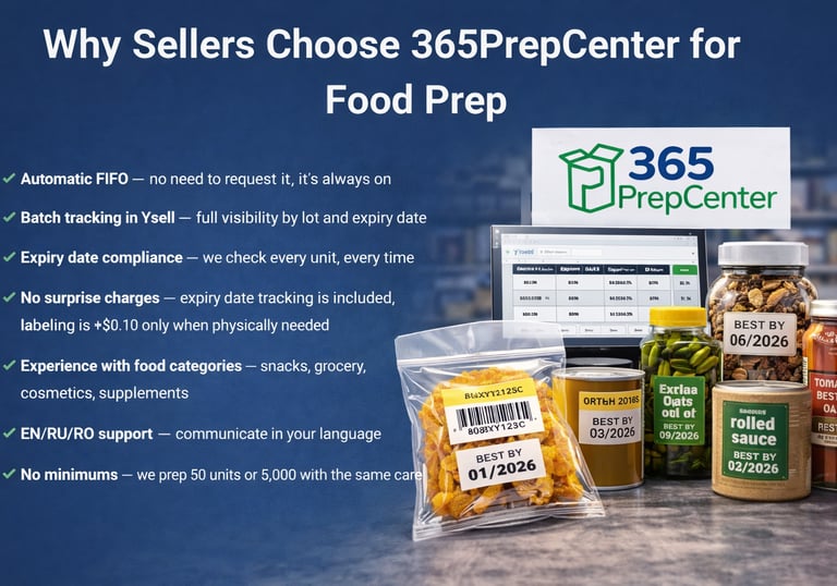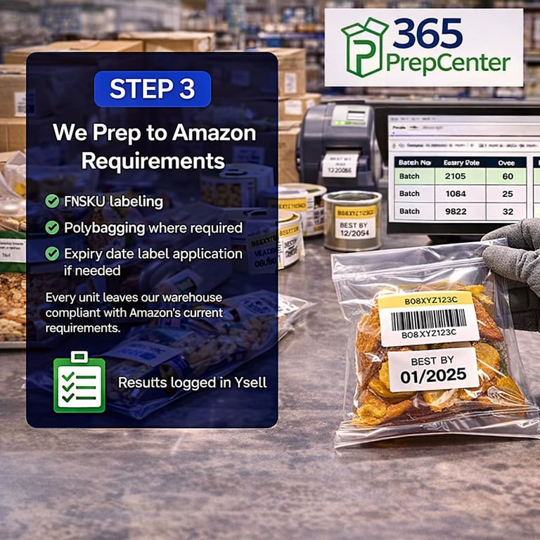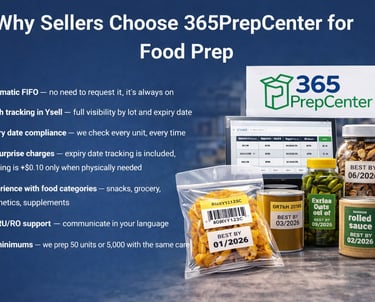 At 365PrepCenter we understand these requirements and apply them automatically to every food and grocery shipment — no extra instructions needed.
