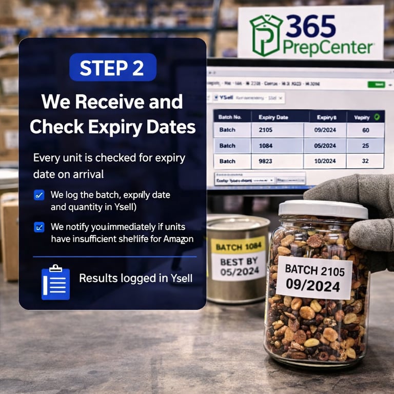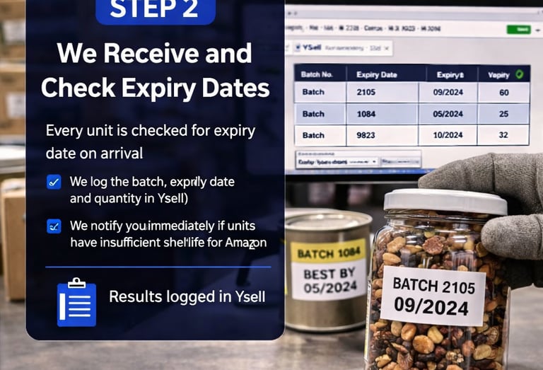 Every unit is checked for expiry date on arrival. We log the batch, expiry date and quantity in Ysell. If any units have insufficient shelf life for Amazon, we notify you immediately before proceeding.