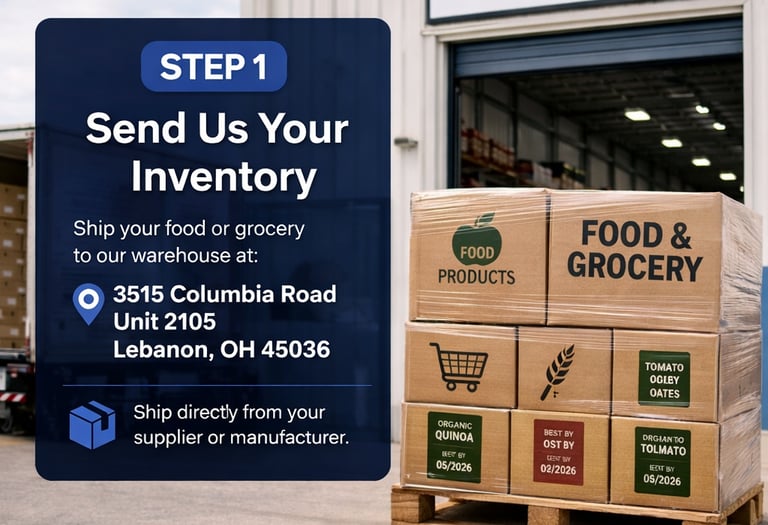 Ship your food or grocery products to our warehouse at 3515 Columbia Road, Unit 2105, Lebanon, OH 45036. Ship directly from your supplier or manufacturer.