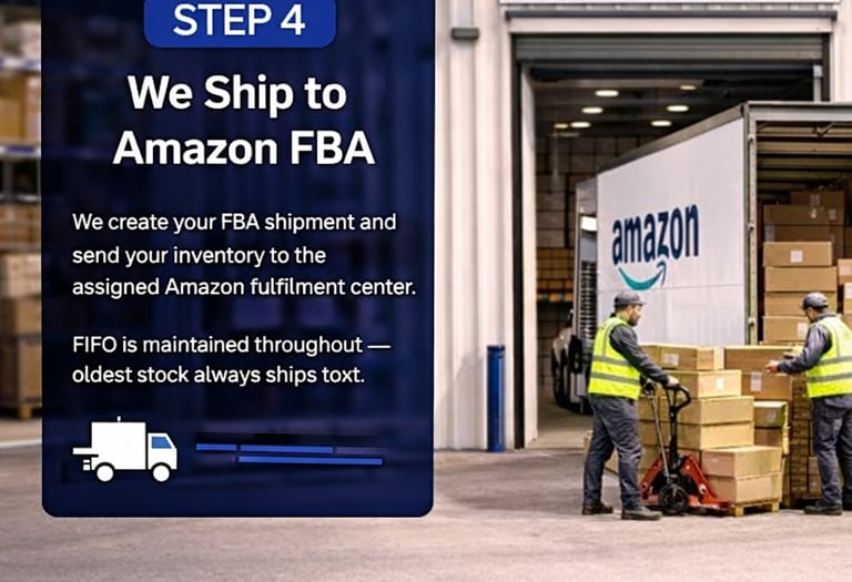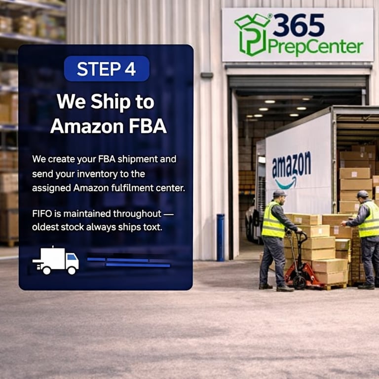 We create your FBA shipment and send your inventory to the assigned Amazon fulfillment center. FIFO is maintained throughout — oldest stock always ships first.