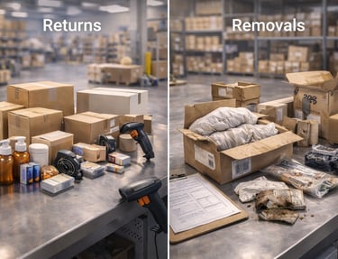 Returns are products sent back by your FBM customers directly to our warehouse. Removals are products that Amazon sends back from their FBA fulfillment centers — either because you requested a removal or Amazon returned customer orders.