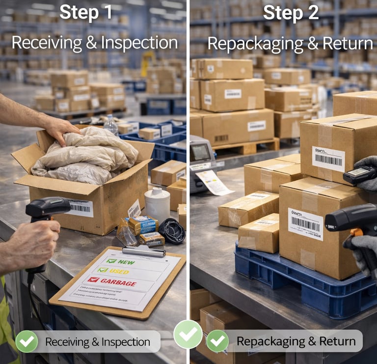 We handle both FBM customer returns and Amazon FBA removals — inspection, grading, repackaging and return to stock or FBA. Every item assessed and reported within 24 hours.